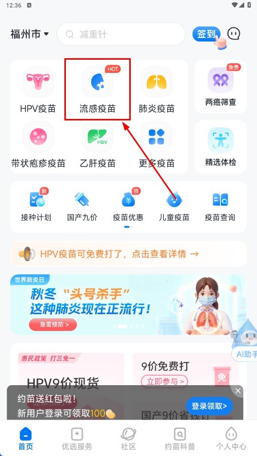 1、在首頁點擊【流感疫苗】這類功能按鈕,即可進入流感疫苗列表頁面。