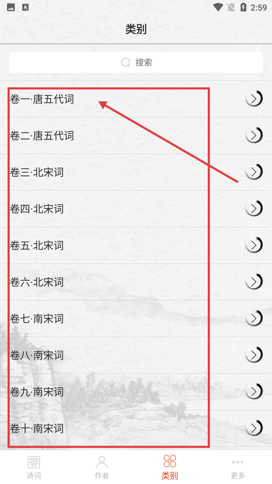 在類別界面,能夠挑選唐五代詞、北宋詞、南宋詞等不同朝代的詞卷,點擊即可進(jìn)入查看具體的詩詞列表。
