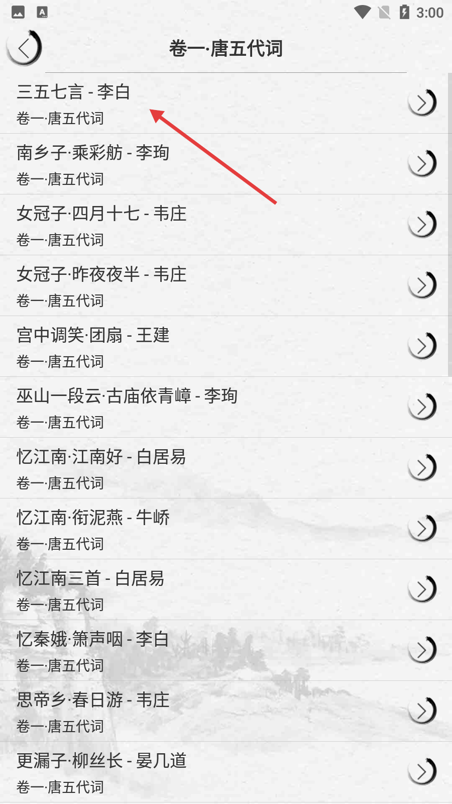 2、進(jìn)入某一詞卷后,可瀏覽該卷中的具體詩詞作品,點擊詩詞標(biāo)題可查看詳情。