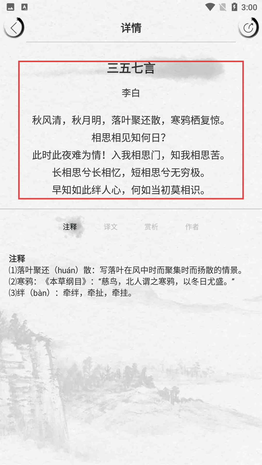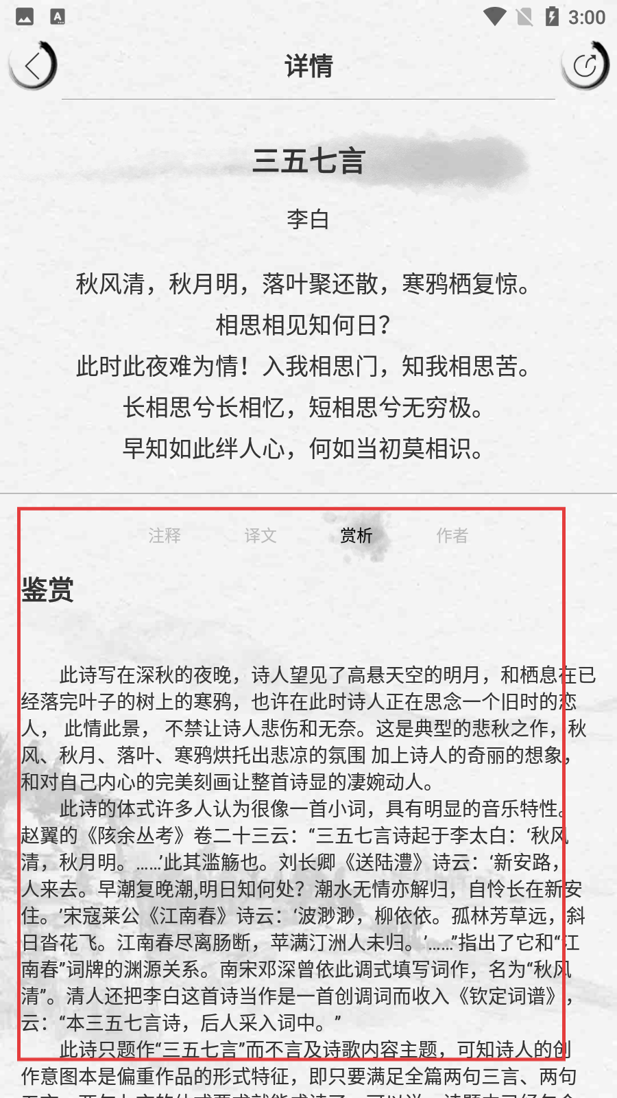 3、在詩詞詳情界面,可查看詩詞原文,同時提供注釋、譯文、賞析、作者等板塊,幫助深入理解詩詞內(nèi)容。