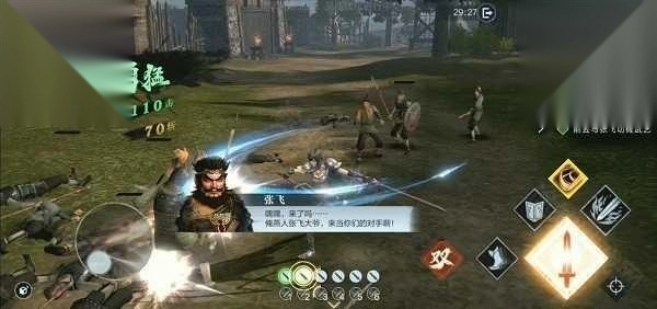 第二階段,對戰(zhàn)張飛。首領戰(zhàn)場景中會出現(xiàn)兩個光圈,將敵將引誘到黃色光圈中接觸其增益狀態(tài),引誘到藍色光圈中則可以冰凍敵將。在一定時間內(nèi),敵將身上會出現(xiàn)破綻提醒,只需要按照提示打出對應的連招,就可以擊潰敵將,獲得輸出的時間。首領戰(zhàn)4分鐘后,敵將進入狂暴狀態(tài),進攻欲望、攻擊力大幅度提升。