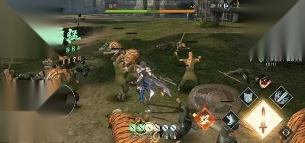 第三階段,擊殺猛虎。同樣是給玩家疊無雙技的階段,猛虎相對靈活,擅長撲擊,需要玩家快速打出連招,在虎群發(fā)動攻勢時搶先一步將其殲滅,盡量使用第6套蓄力連招,攢出無雙技。