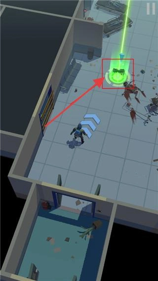 2、按藍(lán)色箭頭指引,探索醫(yī)院房間,避僵尸,找物資(武器、血包),解鎖門,推進(jìn)“死亡黎明”流程,強(qiáng)化生存能力。