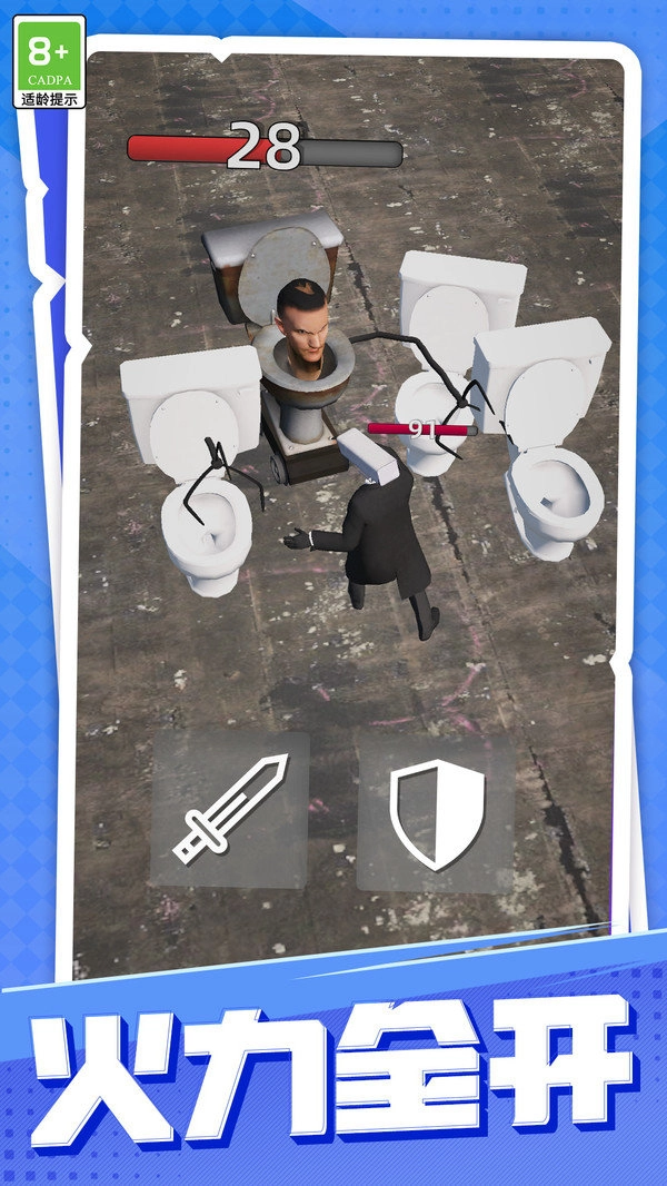 1、核心玩法:玩家需要通過戰(zhàn)斗與解謎相結(jié)合的方式,擊敗馬桶人并完成關(guān)卡任務(wù)。