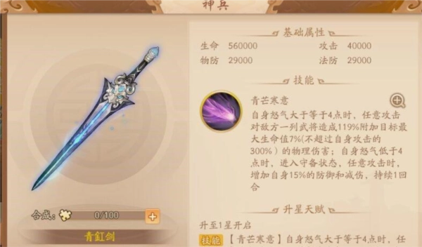 它的技能青芒寒意可以使角色在自身怒氣≥4點的時候,任意攻擊都可以對敵人一列的武將造成119%附加目標最大生命值7%的物理傷害;而當角色自身怒氣低于4時,持有這個神兵的角色可以進入到防守狀態(tài),期間受到的任意攻擊都可以增加自身的15%防御和減傷,持續(xù)一個回合。