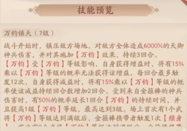 戰(zhàn)斗開始時,鎮(zhèn)壓敵方場地,對敵方全體造成6000%的天御神兵傷害,并對其施加【萬鈞】效果,持續(xù)3回合?!救f鈞】受【萬鈞】等級影響,自身獲得增益時,將有15%乘以【萬鈞】等級的概率無法獲得該增益,每回合最多觸發(fā)12次,自身獲得減益時,將有15%乘以【萬鈞】等級的概率使該減益持續(xù)回合數(shù)增加2回合。受到來自金箍棒的神兵傷害時,有50%的概率延長1回合【萬鈞】的持續(xù)時間,并且提高1級【萬鈞】等級,最高達到3級。場上首次有1個武將【萬鈞】等級達到滿級后,金箍棒攜帶者觸發(fā)1次【殞身】。首次有2個武將【萬鈞】等級達到滿級后,金箍棒攜帶者觸發(fā)1次【碎心】。首次有4個武將【萬鈞】等級達到滿級后,金箍棒攜帶者觸發(fā)1次【滅魂】。