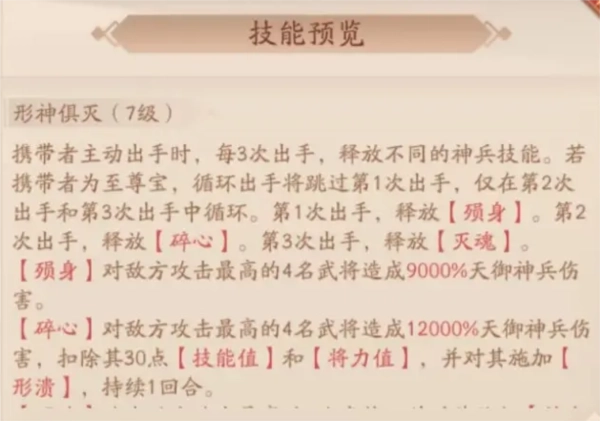 攜帶者主動出手時,每3次出手,釋放不同的神兵技能。若攜帶者為至尊寶,循環(huán)出手將跳過第1次出手,僅在第2次出手和第3次出手中循環(huán)。第1次出手,釋放【殞身】。第2次出手,釋放【碎心】。第3次出手,釋放【滅魂】?!練屔怼繉撤焦糇罡叩?名武將造成9000%天御神兵傷【碎心】對敵方攻擊最高的4名武將造成12000%天御神兵傷害,扣除其30點【技能值】和【將力值】,并對其施加【形潰】,持續(xù)1回合。