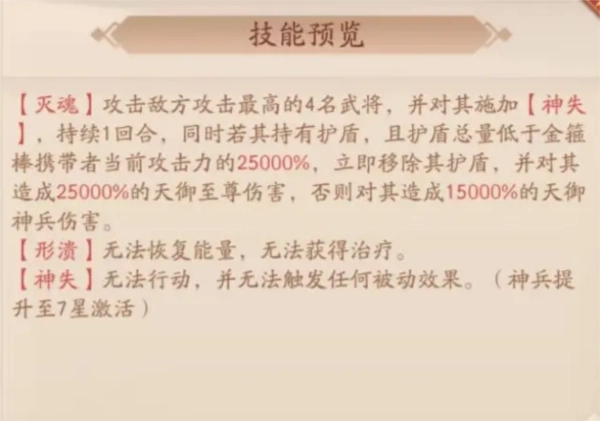 【滅魂】攻擊敵方攻擊最高的4名武將,并對其施加【神失】,持續(xù)1回合,同時若其持有護盾,且護盾總量低于金箱棒攜帶者當前攻擊力的25000%,立即移除其護盾,并對其造成25000%的天御至尊傷害,否則對其造成15000%的天御神兵傷害。