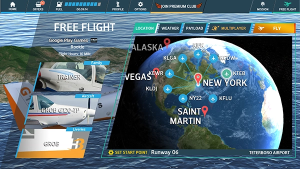1、完成安裝后啟動游戲,點擊界面右上角“FREE FLIGHT”下方的fly按鈕即可開始游戲。