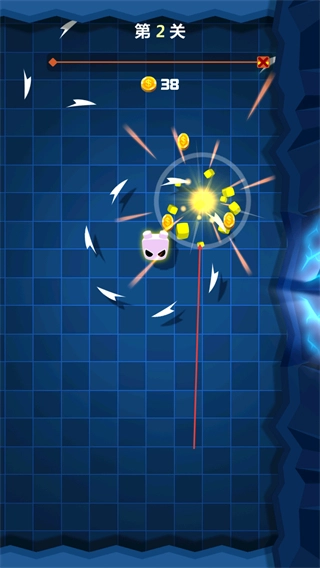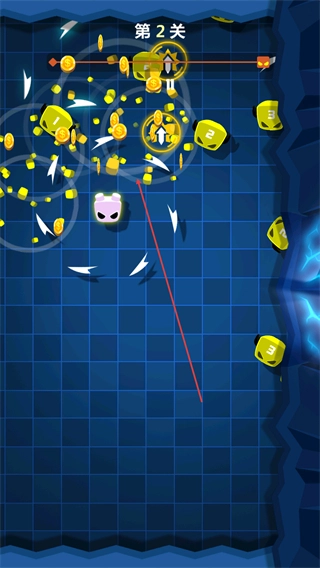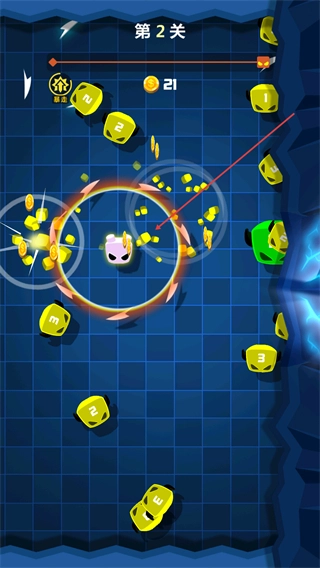 1、在第2關(guān)操控粉色角色旋轉(zhuǎn),撞擊帶數(shù)字的黃色塊,收集金幣,推進(jìn)關(guān)卡進(jìn)度。