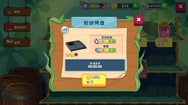 3、你可以隨時進(jìn)入商店,里面陳列著各式各樣的廚具,只要消耗金幣就能將它們購入,而使用這些廚具能夠有效提升工作效率。
