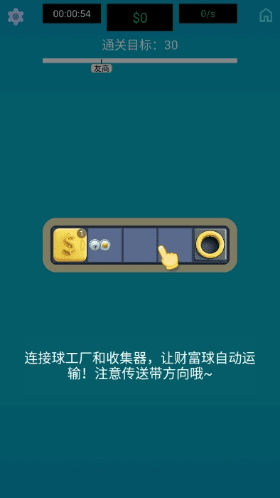 我們把球工廠與收集器連接在一起,讓財富球自動運輸,要調(diào)整傳送帶的方向哦。