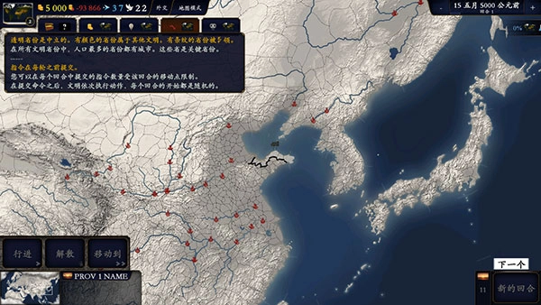三、透明省份是中立的。有顏色的省份屬于其他文明。有條紋的省份被占領。在所有文明省份中,人口最多的省份都有城市。這些省是關鍵省份。指令在每輪之前提交。您可以在每個回合中提交的指令數(shù)量受該回合的移動點限制。在提交命令之后,文明依次執(zhí)行動作,每個回合的開始都是隨機的。
