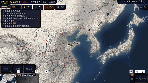 六、底部面板還有3處重要信息:1迷你地圖;2所選省份的信息;3結(jié)束回合或繼續(xù)。當你發(fā)出回合內(nèi)的所有指令后,就可以點擊右下角按鈕結(jié)束本回合。