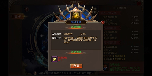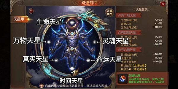 六顆天星全部點亮解鎖炫酷的外觀【奇幻星龍】,和強大的技能【龍魂吐息】,龍魂吐息技能:生命值低于20%時,有3%幾率觸發(fā)恢復生命到80%,技能冷卻時間為60秒。