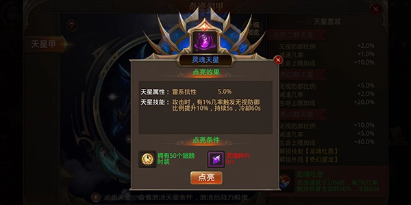 靈魂天星只要你擁有50個翅膀時裝,再獲取一個靈魂碎片,就可以點亮了。