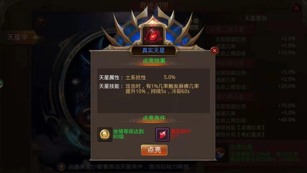 真實天星點亮條件需要坐騎等級達到80級,再獲取一個真實碎片,就可以點亮真實天星了。