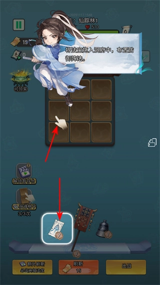 2、進入關(guān)卡布置界面后,將下方的法寶拖拽到上方的格子中完成布置,按照提示合理填充格子,構(gòu)建防御或輸出體系,做好準備。