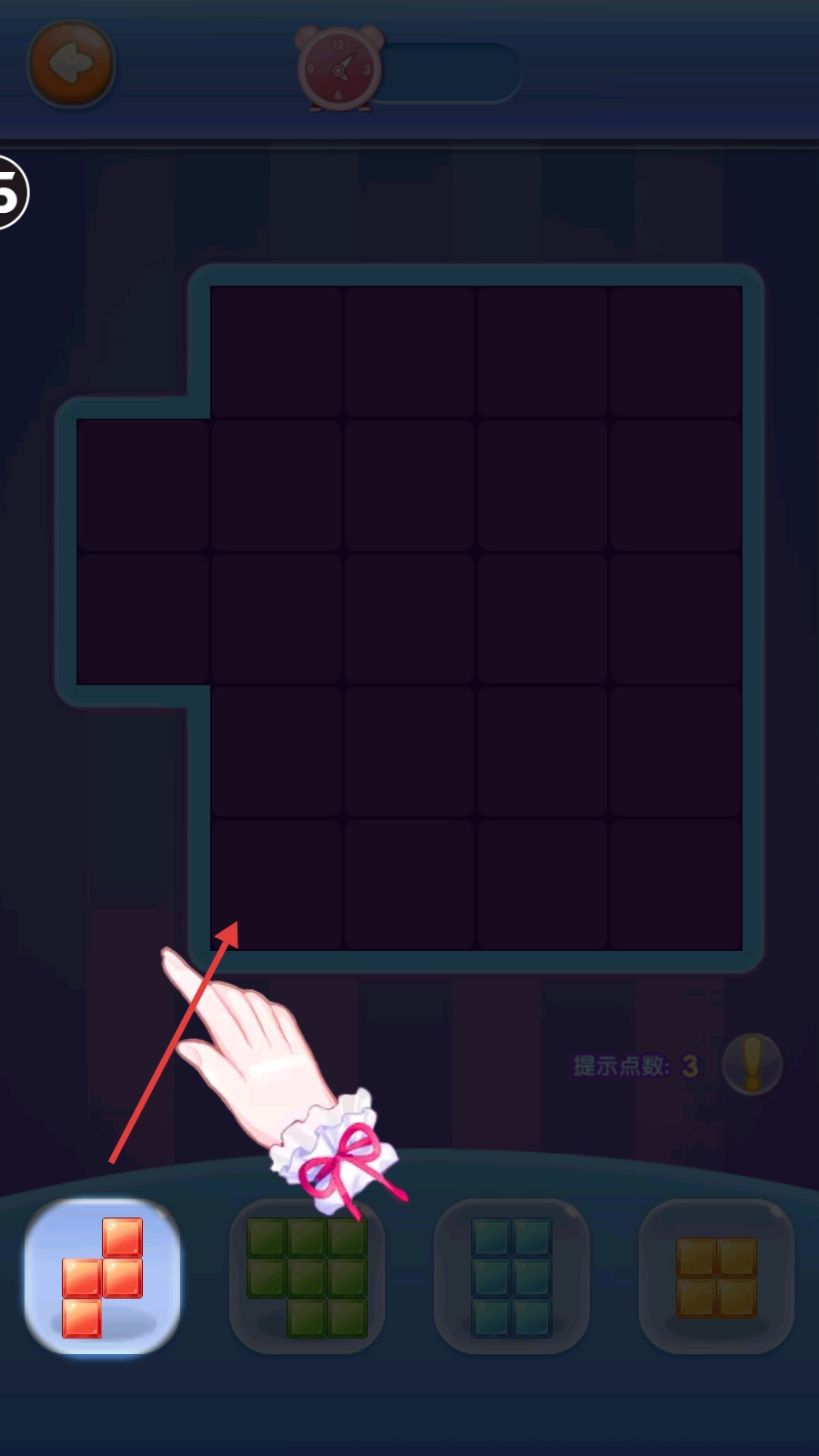 4、按照提示的內容,我們拖動下方合適的方塊,填充上方剩余的格子,推進關卡進度,爭取通關并集齊美麗的服飾吧。