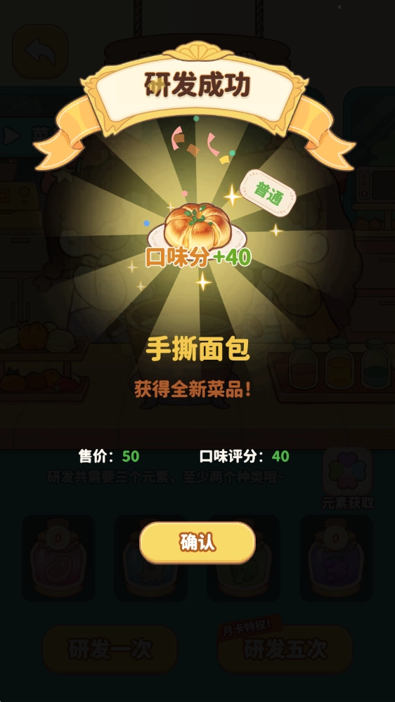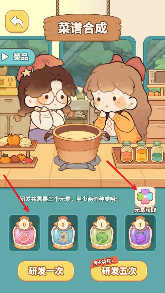 1、第一步是點擊下方的“研發(fā)”選項,研發(fā)新菜品的前提是消耗至少三個元素,所以可以先點擊右側(cè)的元素獲取按鈕來獲取所需元素。