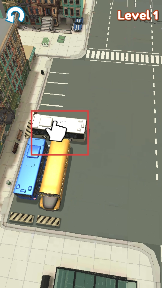 1、進入游戲關卡,點擊白色巴士,操控其移動,開啟移車挑戰(zhàn)。