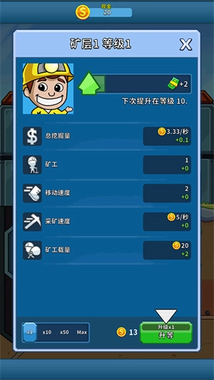 4、電梯運(yùn)輸和地上的運(yùn)輸工需要480個金幣才能進(jìn)行升級,可升級運(yùn)輸速度,運(yùn)輸量,運(yùn)輸工人數(shù)等等。在玩家們攢夠金幣后即可開始升級。當(dāng)經(jīng)理頭上出現(xiàn)小錘子的圖案時,點(diǎn)擊小錘子可以對開采的礦工進(jìn)行加速,不過只有60秒的加速時間。黃色的礦工的箱子里最多可以裝1k的金幣,電梯的也是,地上推小車的礦工也同樣。