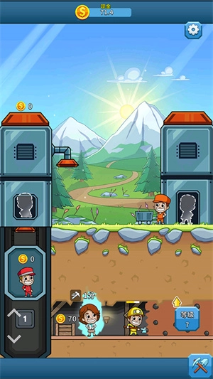 1、先按照新手指引點(diǎn)擊地下礦里穿黃色衣服的礦工,他就會開始挖礦;等礦挖好后,他會把礦石背到左邊靠近電梯的小箱子里。這時點(diǎn)擊電梯中穿紅色衣服的礦工,他會把箱子里的礦石傳送到上方的機(jī)器里。接著點(diǎn)擊地面上推小車的紅衣服礦工,他會推著小車到機(jī)器下方接住金幣,再送回原地。這三個礦工的操作規(guī)律很清晰:地下的黃衣礦工可以持續(xù)挖礦,電梯里的紅衣礦工只需負(fù)責(zé)把挖好的礦石往上運(yùn)送,地面的工人則在機(jī)器下接住礦石并推回原地,這樣就能獲取金幣了。