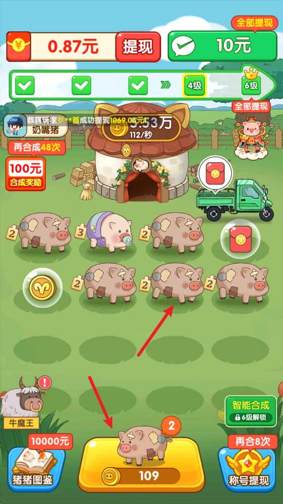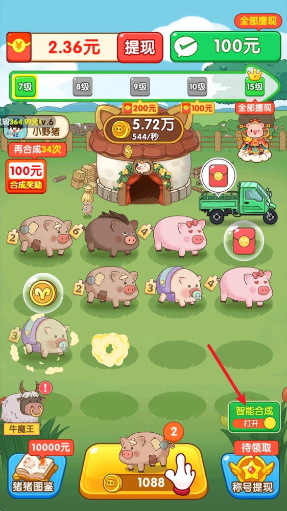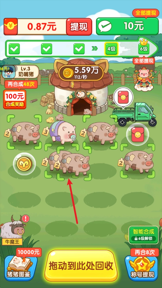 2、游戲中每一次合成都會得到更高一級的小豬,并且解鎖全新豬豬的時候,我們還能夠得到對應(yīng)等級的獎勵呢。