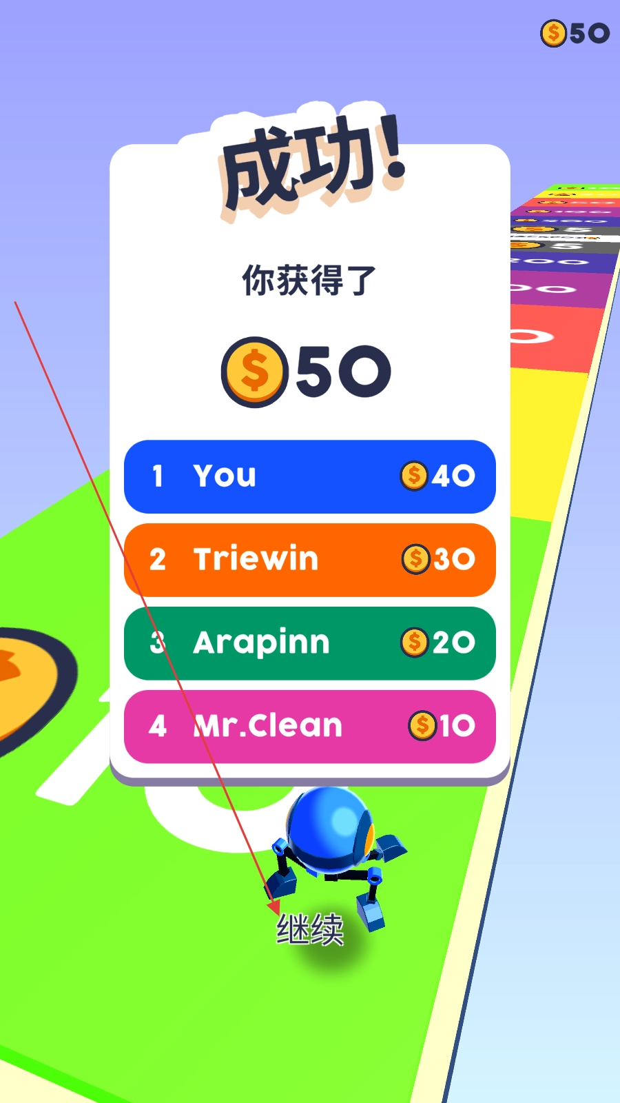 4、沖過(guò)終點(diǎn)后,點(diǎn)擊【繼續(xù)】,獲取金幣,解鎖新關(guān)卡挑戰(zhàn)。