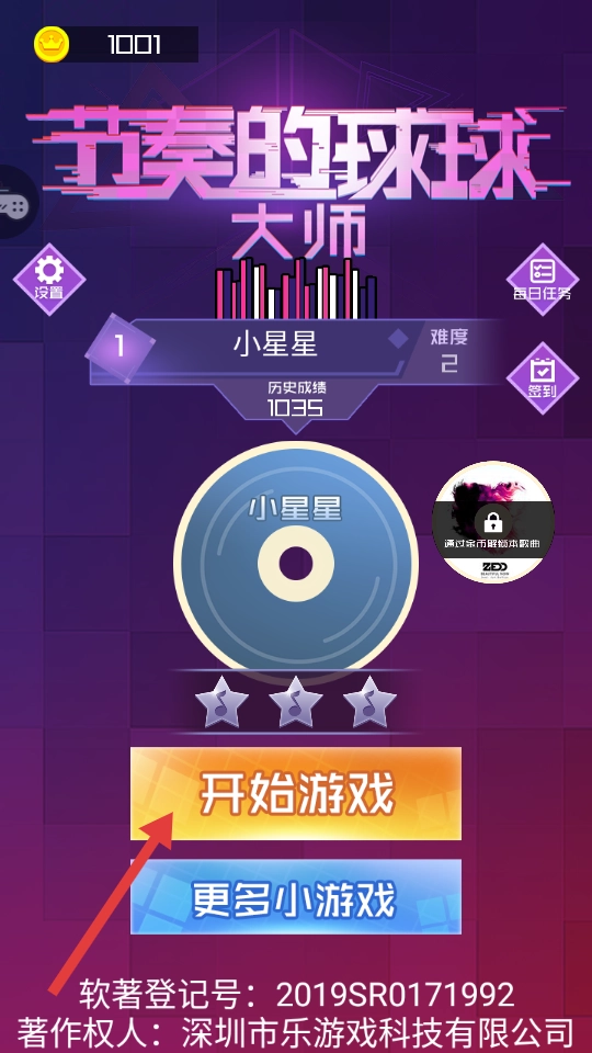 1、點(diǎn)擊橙色【開始游戲】,選擇【小星星】,開啟節(jié)奏類游戲挑戰(zhàn)。