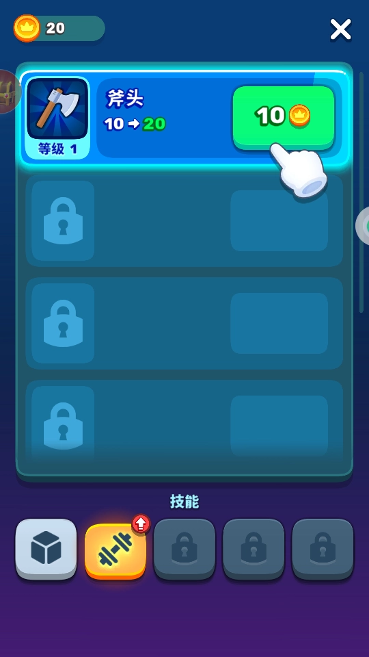 4、在技能界面,花費(fèi)10金幣,可將斧頭技能從10級(jí)升級(jí)到20級(jí),提升斧頭的使用效果。