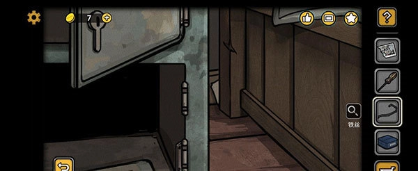 我們回到最初待著的房間,點擊大門,用鉗子剪斷連著的地方,出門后在左邊門的下方取得鐵絲。