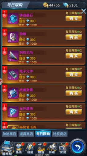然后就是每日限購,那必須是鑄造晶石、狗糧、鋼鐵羽毛、電子元件、戰(zhàn)獸激素、光環(huán)晶塊等等。如果鉆石不足,那么建議優(yōu)先購買狗糧和鋼鐵羽毛,這兩個分別提升寵物和羽翼的,每進階一次都可以給角色提升很大的戰(zhàn)斗力。有時候還會刷出一些打折的材料,像鋼鐵羽毛、腦力因子之類的,只要是不高于五折,都可以購買,畢竟半價購入這些材料還是非常值的,所以就不要吝嗇您的鉆石咯。