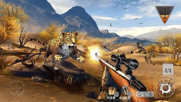 6、先打距離最近的,這樣威力大,瞄的準(zhǔn)。點(diǎn)擊左邊的準(zhǔn)星鍵,切換到望遠(yuǎn)鏡模式,在望遠(yuǎn)鏡模式下,可以通過(guò)觸摸操作來(lái)放大倍率,最大倍率為4倍。然后選擇紅外線(xiàn)拍攝,即可看到獵物的肺部,瞄準(zhǔn)肺部射出子彈。選擇交換可以切換武器。