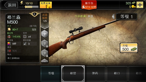 3、你可以給任何槍支升級(jí),升級(jí)項(xiàng)目有槍管、槍口、槍托、瞄準(zhǔn)鏡、紅外線(xiàn)、彈夾容量、彈藥等等。給不同部位升級(jí),性能提升的傾向也有不同。一把武器的好壞,是根據(jù)火力(殺傷力),穩(wěn)定性(準(zhǔn)心漂移區(qū)間變小),最大變焦(放大的倍率)、紅外線(xiàn)(時(shí)間),彈夾(子彈容量)來(lái)決定的。一般來(lái)說(shuō)優(yōu)先升級(jí)火力和穩(wěn)定性。升級(jí)需要效果金錢(qián)或者金條。升級(jí)等級(jí)越高,需要的金錢(qián)數(shù)也越多。