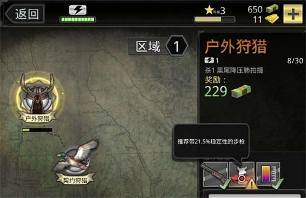 4、當(dāng)你做好準(zhǔn)備工作時(shí),就可以開(kāi)始狩獵了,首先你要先看任務(wù)要求。例如下圖的任務(wù)要求是【殺1 黑尾降壓肺拍攝】意思就是殺死一頭名字叫黑尾降壓的動(dòng)物,利用紅外線(xiàn)功能擊中肺部導(dǎo)致死亡。然后是任務(wù)提示,建議你使用殺傷力為84,穩(wěn)定性在21.5%以上,擁有紅外線(xiàn)功能的步槍。其實(shí)這個(gè)建議也只是建議,如果你對(duì)自己的身手有信心,知道黑尾降壓的肺部在哪里,根本無(wú)需紅外線(xiàn)功能。