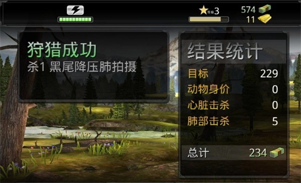 8.獵殺成功后,會(huì)出現(xiàn)結(jié)果統(tǒng)計(jì)。任務(wù)完成的金錢(qián)數(shù),動(dòng)物身價(jià)數(shù),擊殺部位數(shù)的總計(jì)為你的金錢(qián)數(shù)。