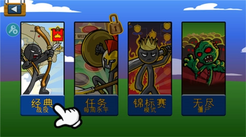 1、進(jìn)入火柴人戰(zhàn)爭遺產(chǎn)召喚版中文最新版,點(diǎn)擊開始游戲,選擇游戲模式;