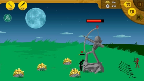 3、回到游戲后,我們可以通過屏幕右上角有三個(gè)按鈕,向左的箭頭按鈕點(diǎn)擊后,火柴人就會自動(dòng)退守到基地后, 當(dāng)敵人進(jìn)攻時(shí),弓箭手會自動(dòng)攻擊,并且也只有它可以攻擊到敵人,不過如果玩家龜縮在基地,基地耐久也會掉哦。