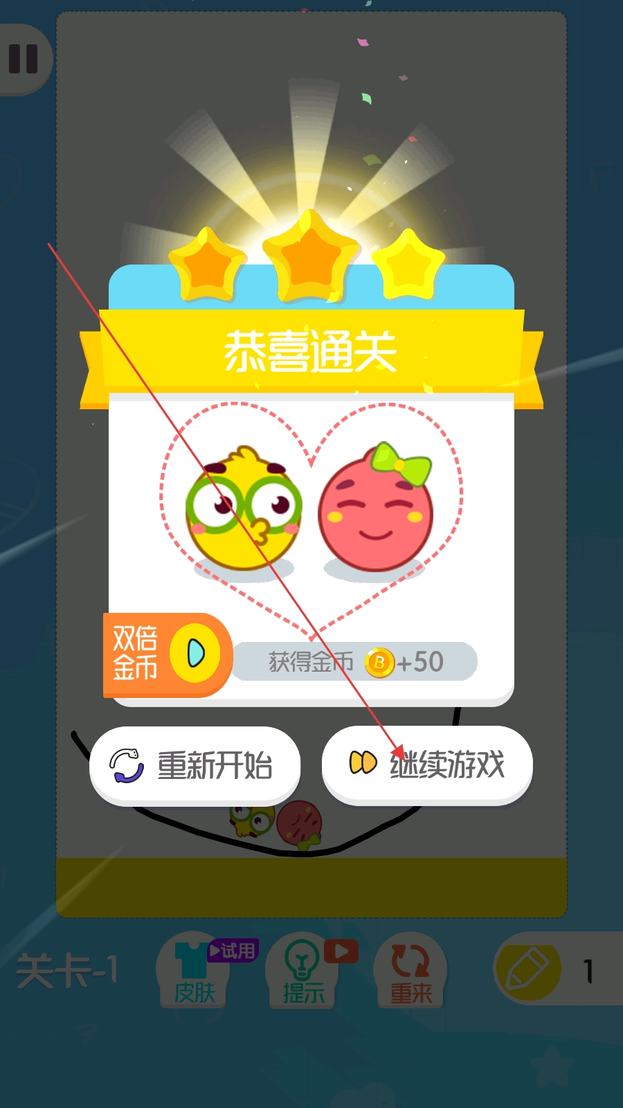 3、通關(guān)后點【繼續(xù)游戲】解鎖新關(guān)卡,也可看廣告【雙倍金幣】,積累金幣用于皮膚解鎖。