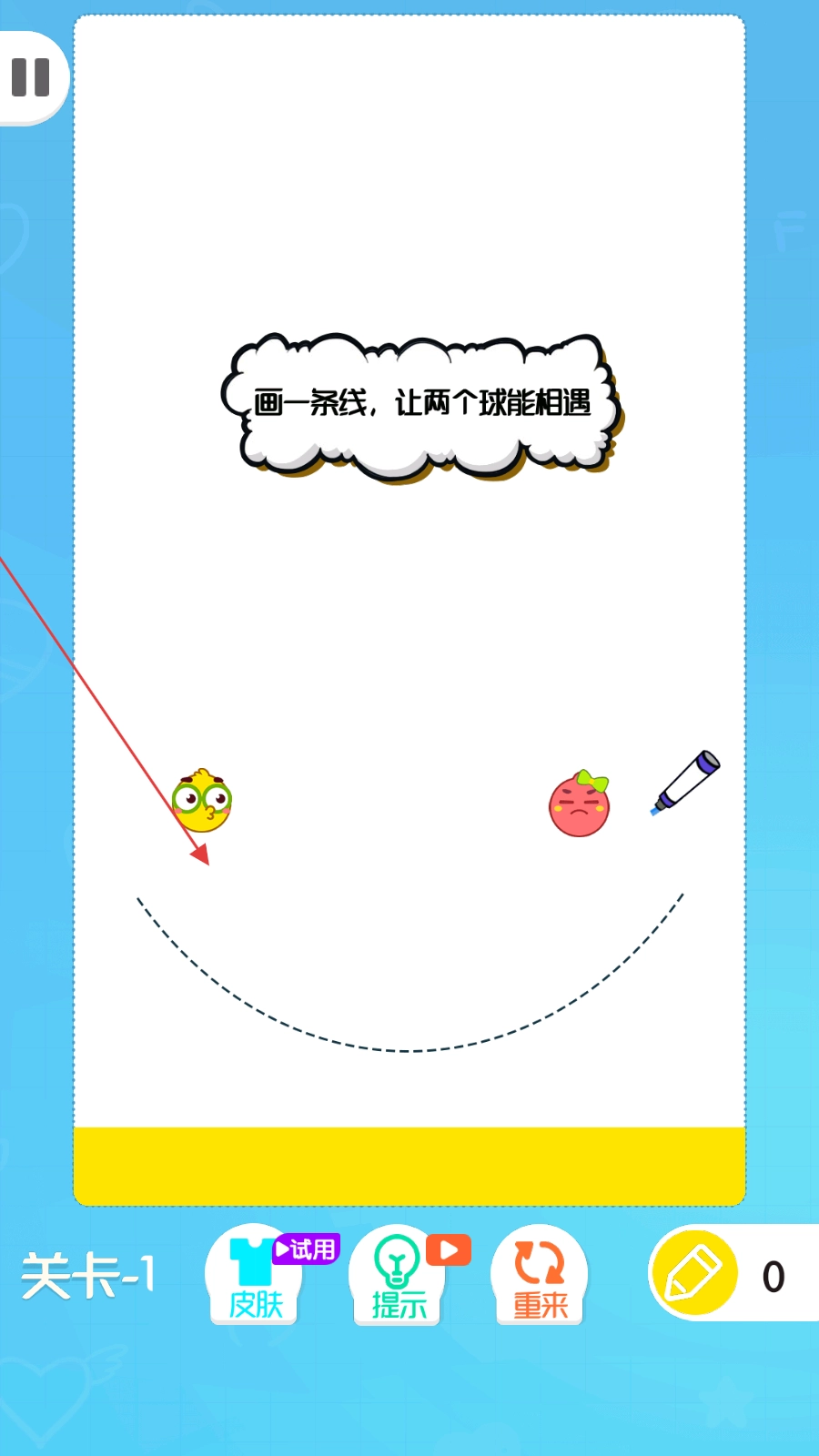 2、關(guān)卡1按提示畫弧線,讓兩球相遇,遇難題點【提示】,失敗點擊【重來】重新畫線。