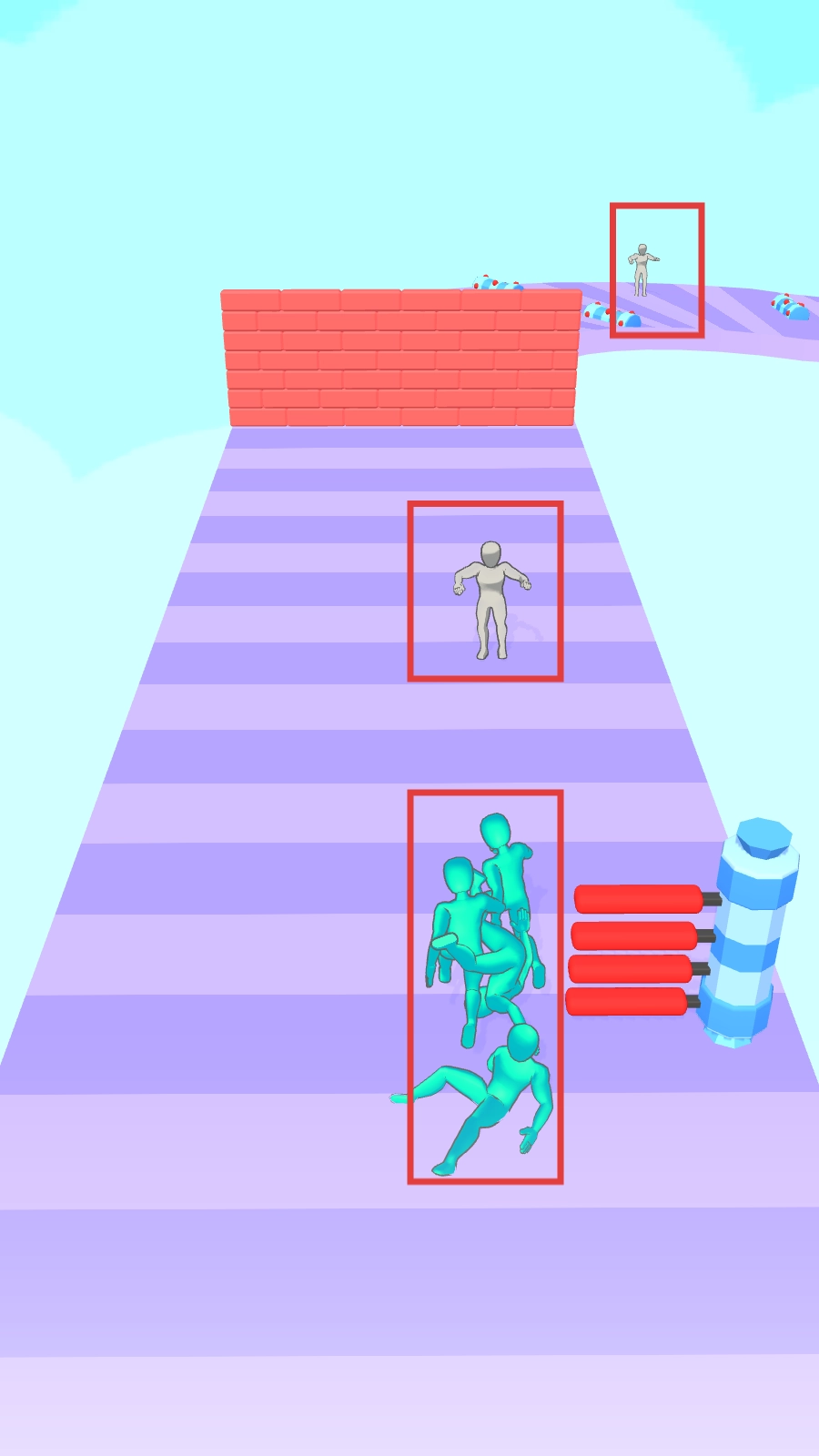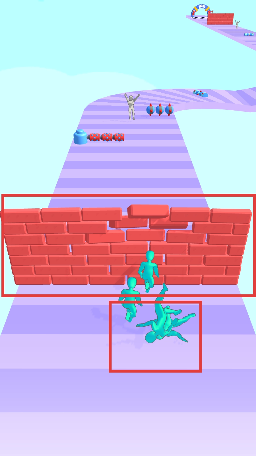 3、遇到磚墻等障礙,可以用壯大后的隊(duì)伍撞擊,每次撞擊都會(huì)損失隊(duì)友,所以我們要提前募集更多隊(duì)友,才能保證撞擊后繼續(xù)前行,一路推進(jìn),沖向終點(diǎn)處的拱門(mén)吧。