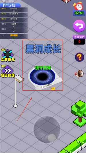 1、通過滑動屏幕控制黑洞移動方向,持續(xù)吞噬比自己小的物體來增長體積,體積越大可吞噬的目標(biāo)越多,實力也越強。
