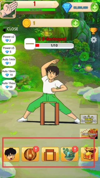 4、基礎(chǔ)挑戰(zhàn):點(diǎn)擊屏幕完成單磚劈砍,熟悉基本操作和節(jié)奏控制。