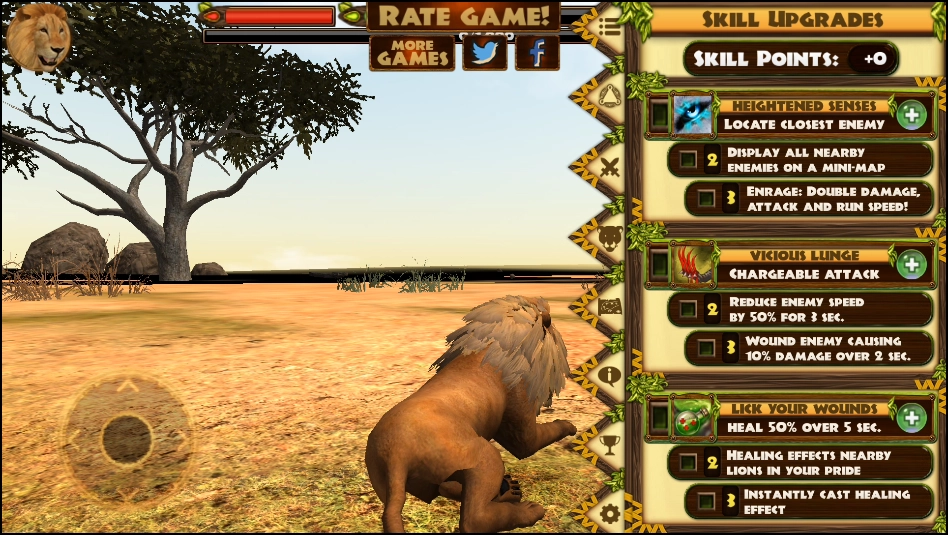 通過狩獵、探索和戰(zhàn)斗積累經(jīng)驗(yàn),逐步強(qiáng)化你的獅王!每升一級(jí)都能解鎖全新屬性點(diǎn)和專屬技能樹,比如快速療傷、精準(zhǔn)追蹤獵物、爆發(fā)式?jīng)_刺等,讓每只獅子都擁有獨(dú)一無二的生存風(fēng)格。