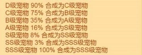 要合成需要兩個相同品質(zhì)的寵物才可以,并且在合成的過程也有成功合成的,也有合成失敗的,寵物合成的成功率從低級寵物到高級寵物,合成成功的概率依次遞減,各級合成成功的概率分別為: