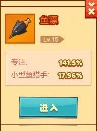 4、最后一個要介紹的是魚漂,它的獨特屬性在于能提升我們的專注度。要是大家不太明白這一點,我舉個例子就能說清楚了。咱們釣魚時經(jīng)常遇到兩種情況:好不容易等來大魚,結(jié)果要么魚線斷了,要么魚脫鉤跑了。相信這種經(jīng)歷大家都不陌生,我當(dāng)時遇到時也氣得不行。所以只要把魚漂的等級升上去,就能減少魚跑掉的情況;再搭配提升魚線的等級,就能進一步提高我們成功釣上魚的概率了。