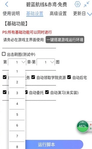 3.點(diǎn)擊運(yùn)行腳本,在彈出的碧藍(lán)航線(xiàn)輔助功能界面,勾選自己需要掛機(jī)的功能后,點(diǎn)擊右上角窗口最小化按鈕;