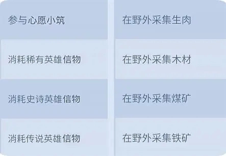 6、資源產(chǎn)出上,獵人之家負(fù)責(zé)生產(chǎn)肉類,伐木場產(chǎn)出木材,煤礦場開采煤炭,鐵礦場獲取鐵礦;藍(lán)色英雄的技能能夠提升這些資源的產(chǎn)量。在進(jìn)行外出采集活動(dòng)時(shí),建議搭配4個(gè)藍(lán)色英雄,他們分別是:擅長加快肉類采集速度的克勞瑞斯、能提升木材采集效率的尤金、可加速煤炭采集的查理,以及助力鐵礦采集提速的史密斯。