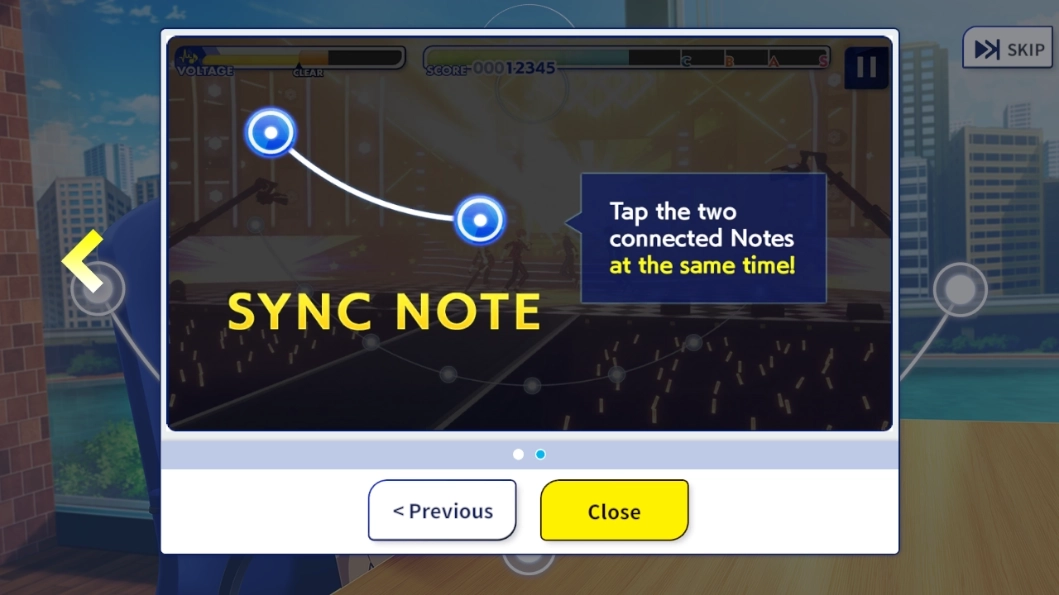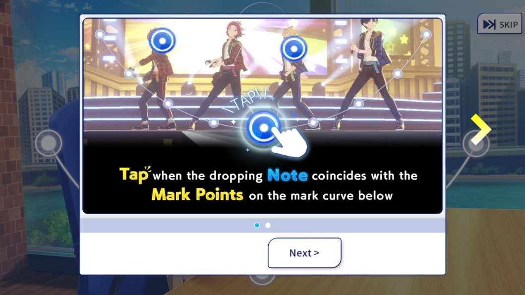 3、教程階段將直觀演示核心玩法邏輯:當(dāng)藍(lán)色音符精準(zhǔn)落至下方軌道白點時,及時點擊觸發(fā)判定;